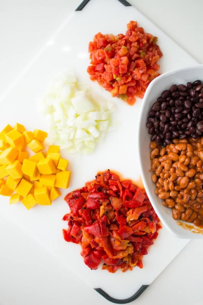 • Prep your ingredients ahead. Cube butternut squash, chop onions, and drain beans, peppers and chilis. (If needed, here’s a great tutorial for cubing butternut squash.)