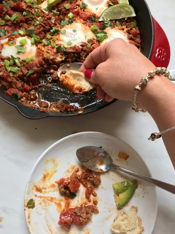 If you’ve never had shakshuka then I recommend you try is STAT! Seriously, it is the EASIEST way to make an impressive breakfast, brunch or dinner and packs in wholesome ingredients. I also love the flexibility in the recipe! This particular recipe uses ground beef to for an extra boost of flavor, texture and nutrition but when searching online, I found so many ways to make this traditional Tunisian dish. With a quick search, options including everything from a Mexican-inspired versions to a Mediterranean-inspired versions to a green shakshuka that uses fresh tomatillos appeared. The versatility makes the recipe fun and always keeps it fresh and entertaining.