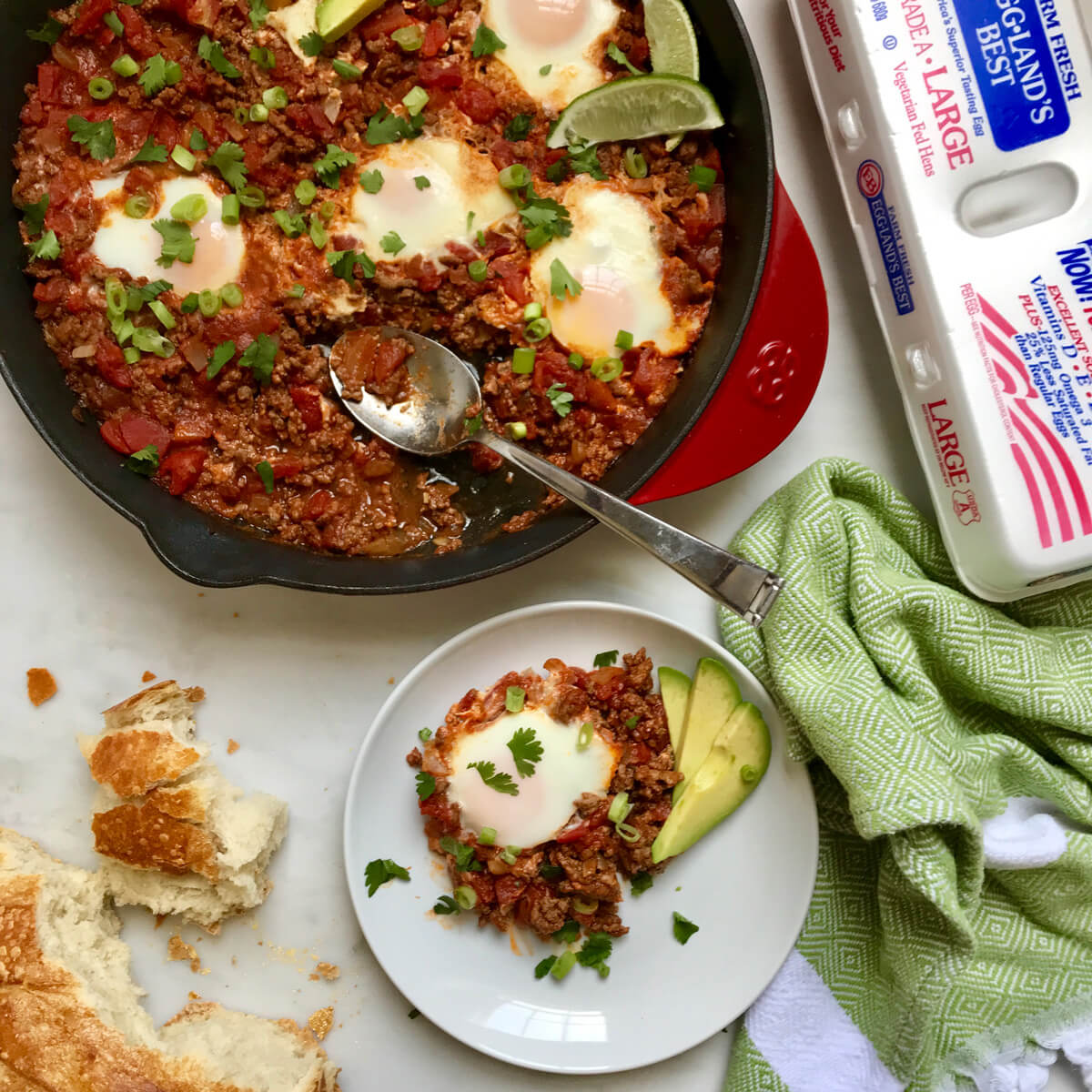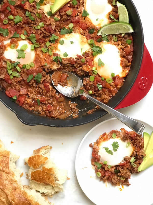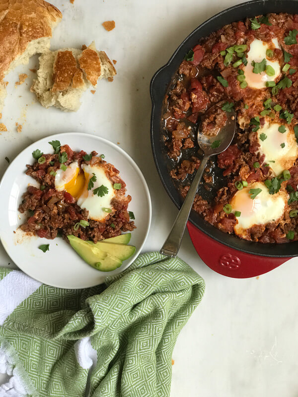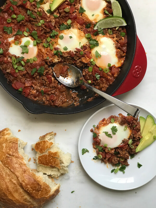 If you’re pressed for time, make the beefy sauce ahead of time and store in the fridge. When you’re ready to eat, heat it up in the skillet then add the eggs to poach. Note that you may need to add a bit of liquid.