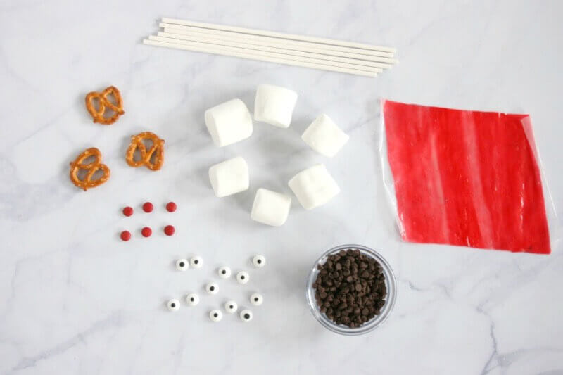 2. Place cake pop sticks into large marshmallows. Cut small slits in the top of the marshmallow to enable you to push the pretzel “antlers” in later.